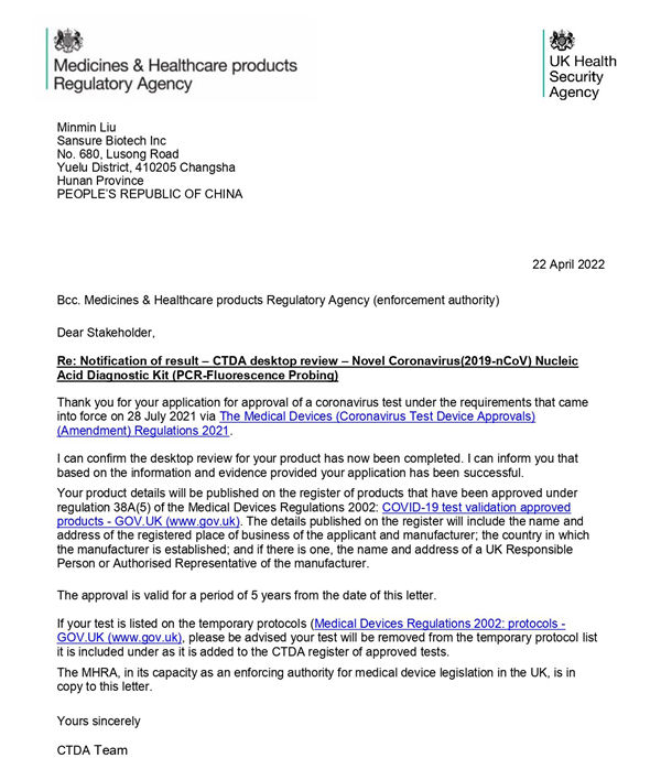 近日,米兰生物研发的新型冠状病毒(2019-nCoV)核酸检测试剂盒(荧光PCR法)获得英国CTDA批准,此前该产品已完成MHRA注册,这意味着该核酸检测试剂可在英国市场合法销售。这是自英国政府针对新冠检测试剂执行注册新规后,国内首个获批的新冠核酸检测试剂,也是该产品继获得欧盟CE、美国FDA等40多个国际认证之后,获得的又一国际权威认证。